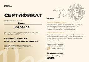 Меня зовут Елена Юрьевна Шабалина, и это мой личный сайт. Психологией я заинтересовалась задолго до получения профессионального психологического образования, более тридцати лет назад. Первое высшее образование, учёба на факультете технической кибернетики, как оказалось, стали отличной школой и подготовкой к следующей, новой профессии - психолога. Пять лет серьёзной каждодневной учёбы, изучение высшей математики и физики, телемеханики и теории космических аппаратов невероятно расширяют кругозор и дают чёткое представление о гармоничном, уникальном, взаимосвязанном и системном устройстве окружающего мира, жизни каждого отдельного человека, семьи, народа, человечества... Эти базовые понятия и представления очень помогают в труде психолога и преподавателя. Почти через двадцать лет после первого ВУЗа были второй - психология, третий - семейная психология, четвёртый - психология клиническая. И кто знает, кто знает... Всю жизнь, начиная со школьных лет, принимаю участие в общественно-полезной деятельности.