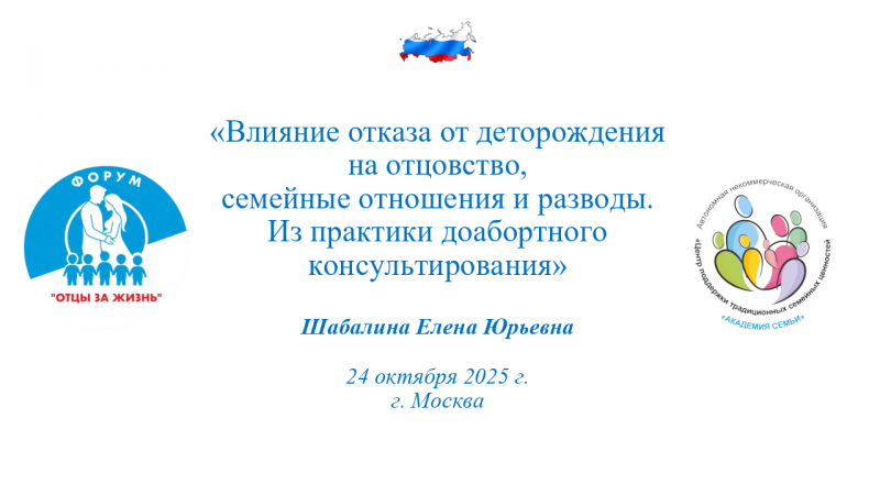Тема моего выступления: "Влияние отказа от деторождения на отцовство, семейные отношения и разводы. Практика доабортного консультирования».
