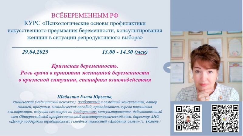 Лектор: Шабалина Елена Юрьевна, директор АНО "Центр поддержки традиционных семейных ценностей «Академия семьи», клинический (медицинский) психолог, системный семейный консультант, тренер, преподаватель, автор методики и ведущая обучающих семинаров по доабортному консультированию, действительный член Общероссийской профессиональной психотерапевтической лиги.