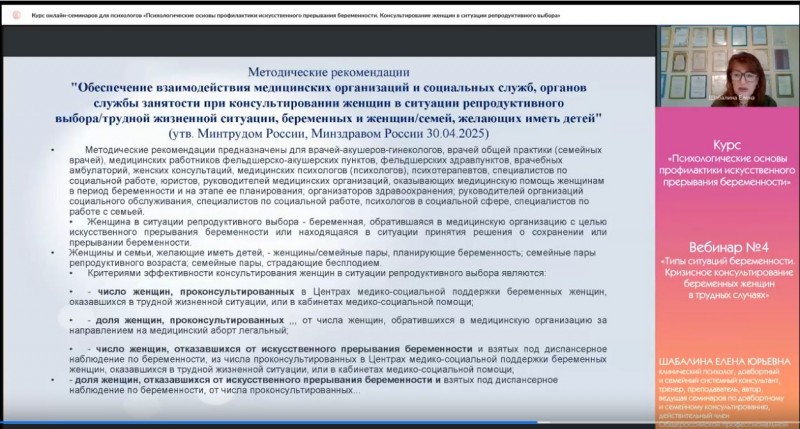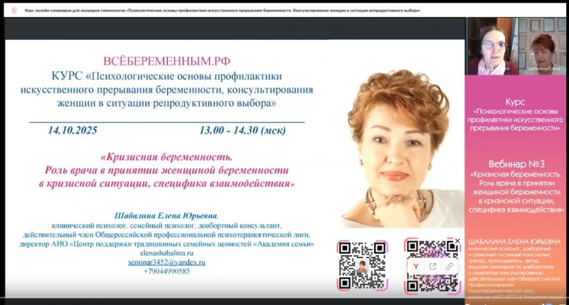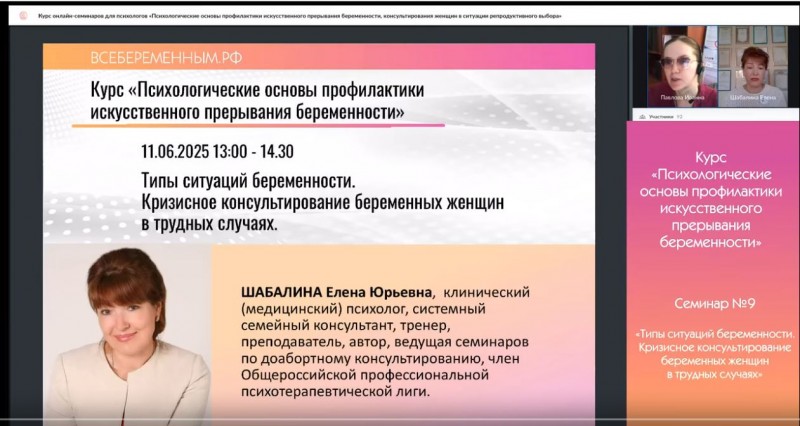 В целях повышения качества оказания помощи беременным женщинам, поддержки материнства и повышения рождаемости в 2025 году прошёл Курс онлайн-семинаров «Психологические основы профилактики искусственного прерывания беременности. Консультирование женщин в ситуации репродуктивного выбора». Курс проводился общероссийским общественным проектом ВСЕБЕРЕМЕННЫМ.РФ, совместно с профильными общественными организациями по программе проекта комплексной профилактики абортов «Плюс один», организованного совместно с Всероссийским общественным движением добровольцев в сфере здравоохранения "Волонтёры-медики".