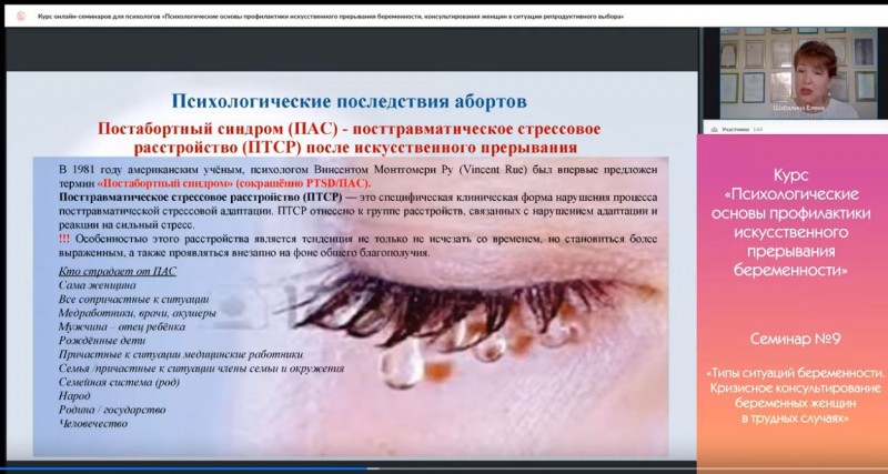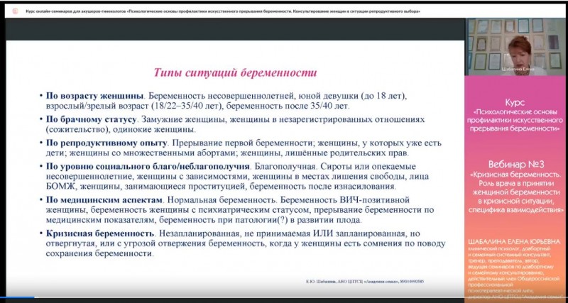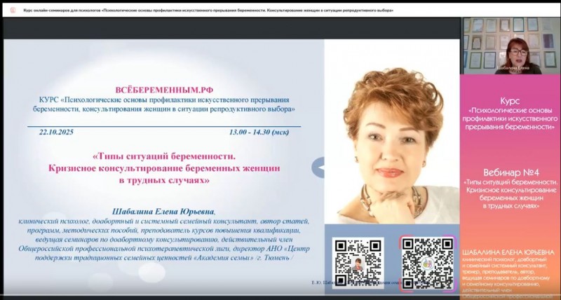Для каждой целевой аудитории в рамках данного учебного проекта предусмотрены серии из нескольких вебинаров. Среди преподавателей Елена Юрьевна Шабалина, директор АНО "Центр поддержки традиционных семейных ценностей "АКАДЕМИЯ СЕМЬИ", эксперт по проблеме абортов, клинический психолог, системный семейный консультант, тренер, преподаватель, автор, ведущая семинаров по доабортному консультированию, действительный член Общероссийской профессиональной психотерапевтической лиги. В План обучения проекта комплексной профилактики абортов в 2025 году включены несколько вебинаров Елены Юрьевны.